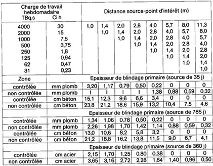 Nous nous sommes limités aux données de transmission pour les sources gamma de haute et moyenne activités les plus fréquentes que l'on retrouve en médecine nucléaire et en radiographie industrielle en plus de la source spéciale de 57Co. Avant d'aller sur place établir les équivalents de plomb des murs à évaluer, nous conseillons d'expérimenter avec une source choisie pour mesurer les débits d'exposition apparents au-delà de feuilles de plomb, de murets typiques munis de plomb, ou au-delà de dalles de béton simulant les murs blindés prévus. Ceci se fait devant un tunnel plombé afin de réduire la diffusion en utilisant des distances typiques et en utilisant les compteurs disponibles ayant suffisamment de sensibilité.